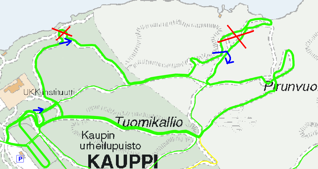 Kilpavitonen: Seurataan maastoon sinisellä merkittyä Kilpavitosen reittiä. Maastoon merkitystä reitistä poiketaan ainoastaan siltä osin, että UKK-instituutin jälkeistä lyhyttä hevosenkenkää ei kierretä, koska kyseistä reittiä ei ole avattu.