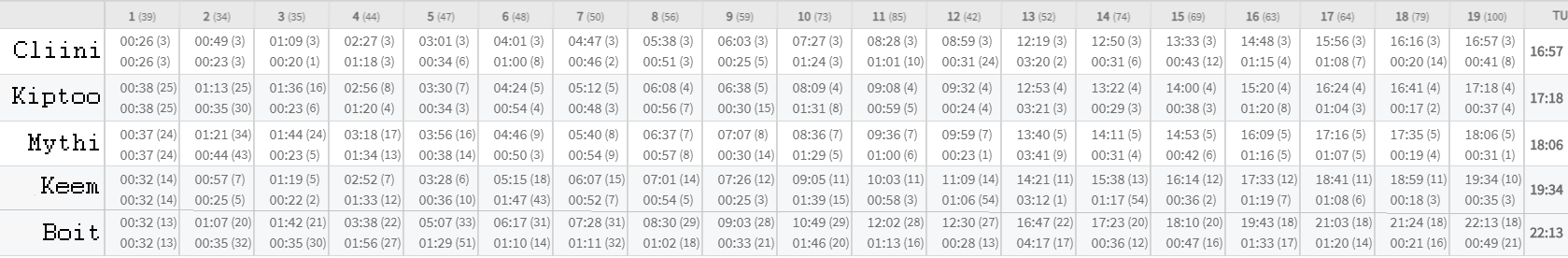 | 2. | Kiptoo | 13 | 10 | 8 | 0 | 11 | 13 | 11 | 11 | 77 | 59 |